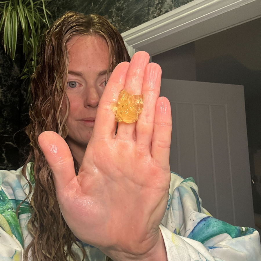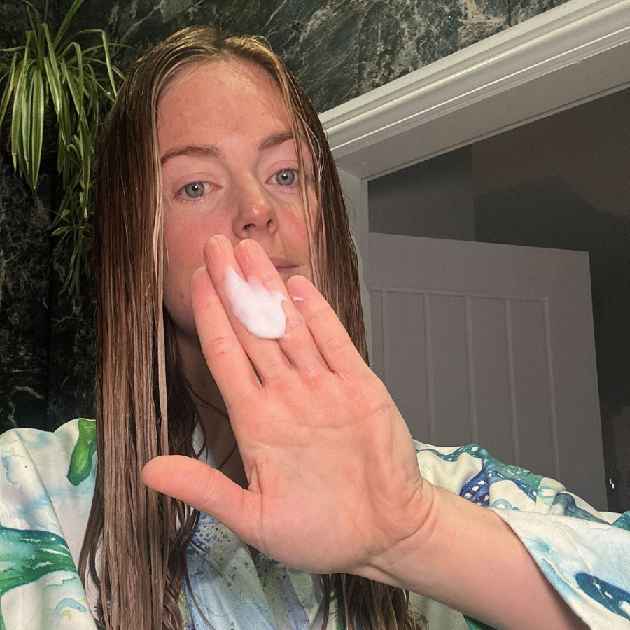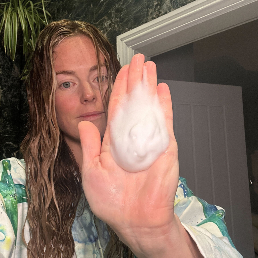 In the shower, I start with just under a palmful of shampoo to cleanse my hair.