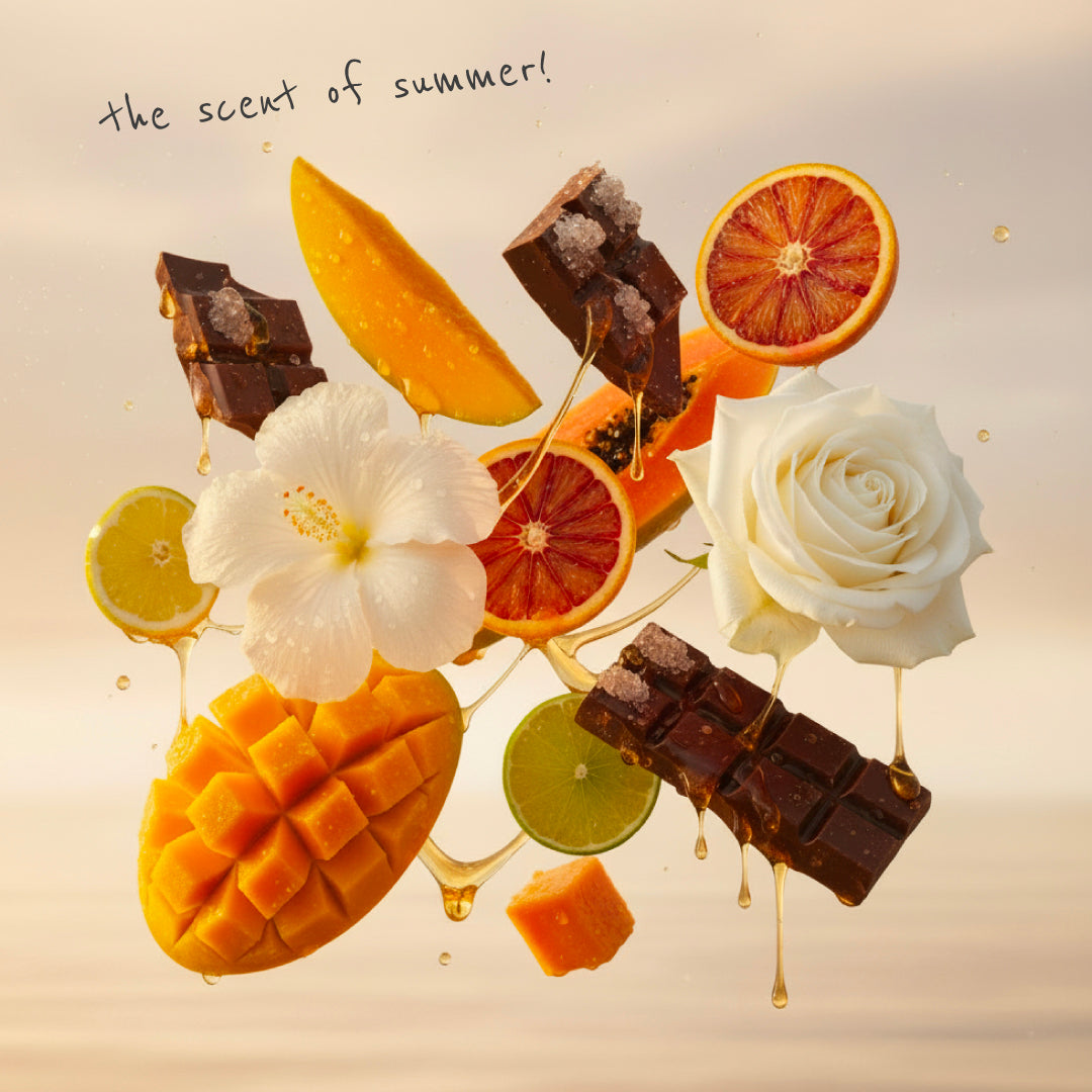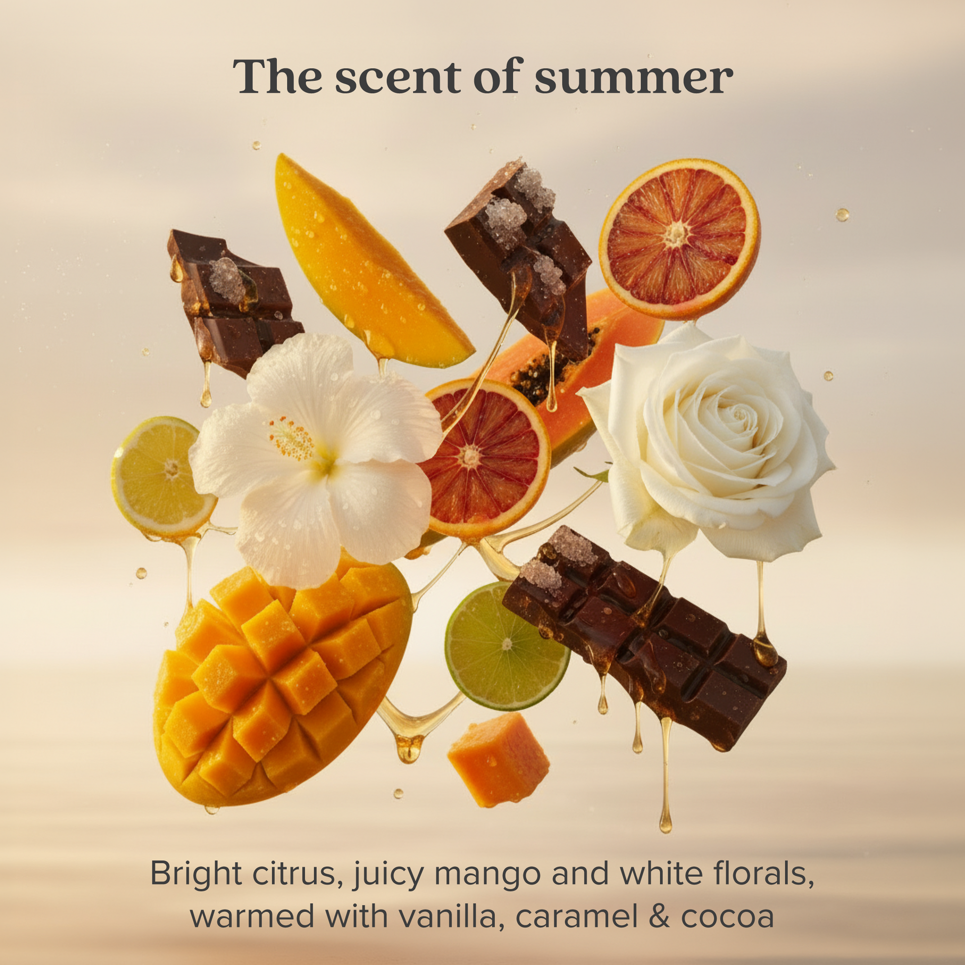 Bright citrus and juicy mango, softened with white florals and finished with warm vanilla, caramel, and cocoa. Fresh, sweet, and sunshine-warm - like summer in your hair.