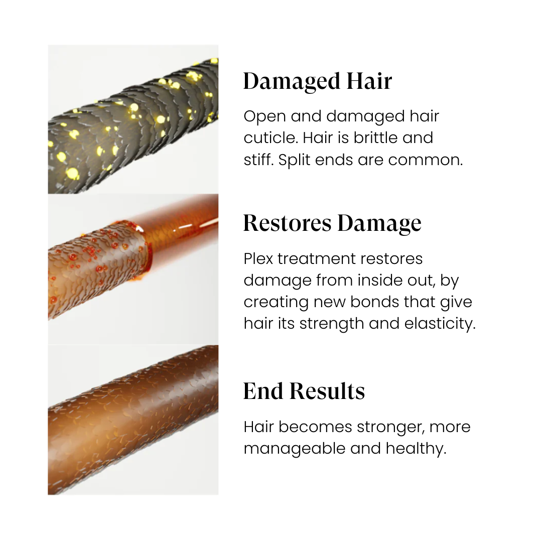 As the plex treatment re-builds your hair bonds, it strengthens the hair from within, making it more resistant to breakages and damage.
