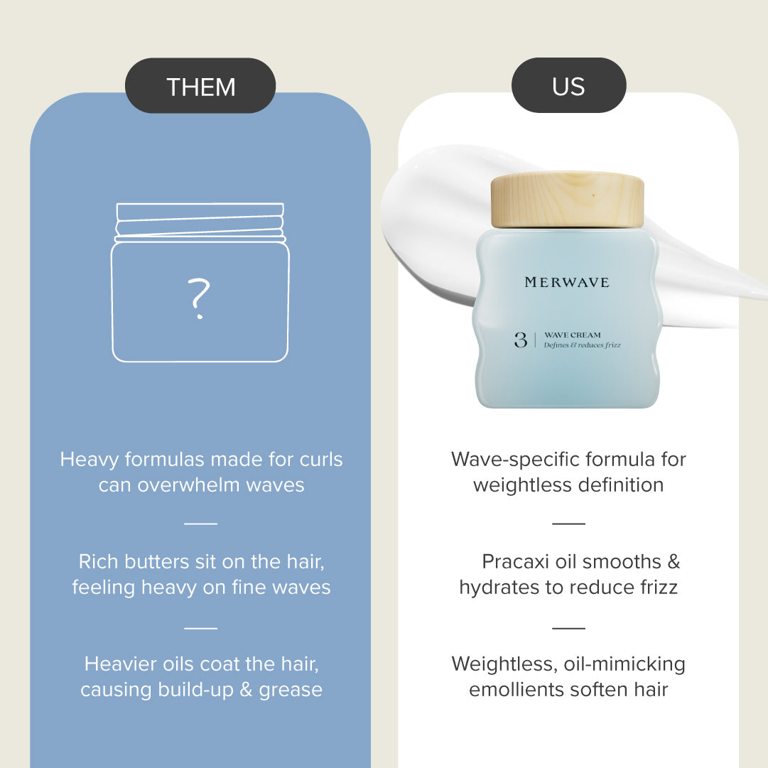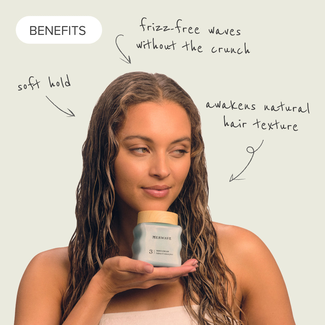 A super lightweight formula that awakens natural texture, effortlessly styling with a soft hold. Smooths and hydrates hair with powerhouse ingredients pracaxi oil and flaxseed extract – locking in moisture for frizz-free waves without that heavy, greasy, crunchy feel. Best when used as the third step in Merwave’s five-step wavy hair routine.